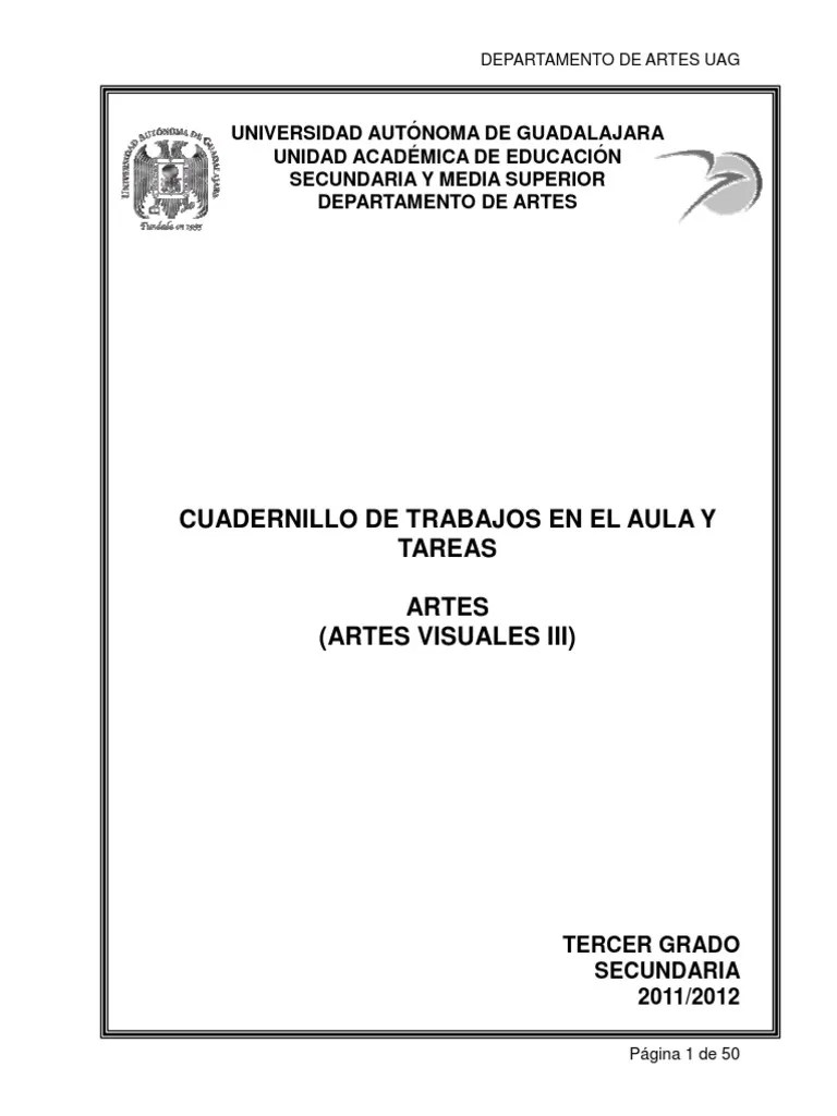 El cuadernillo de trabajo que vamos a presentarte en esta oportunidad está estructurado de manera tal que el alumno podrá verificar los contenidos que impartirá el maestro en las clases e incluye varias hojas de trabajo para que cada estudiante realice los ejercicios y actividades... Sus diferentes actores y sus procesos de trabajo 76 secuencia 2. La inserción de las artes visuales en la escuela tiene como objetivo central ampliar el. Ahora que ya conoces que son las artes visuales, abordaremos qué es la expresión dentro del arte. La producción artística 102 bloque 3. Estudiosos, conservadores y comerciantes de imágenes 92 secuencia 3. Anexo # 1 clase 5 … Si bien la propuesta es para los alumnos del ciclo básico de la educación secundaria,.. Departamento de artes cuadernillo de trabajos en el aula y tareas artes (artes visuales iii) tercer grado secundaria 2011/2012 página 2 de 50 universidad autónoma de guadalajara unidad académica de educación secundaria y media superior artes visuales iii nombre del alumno: